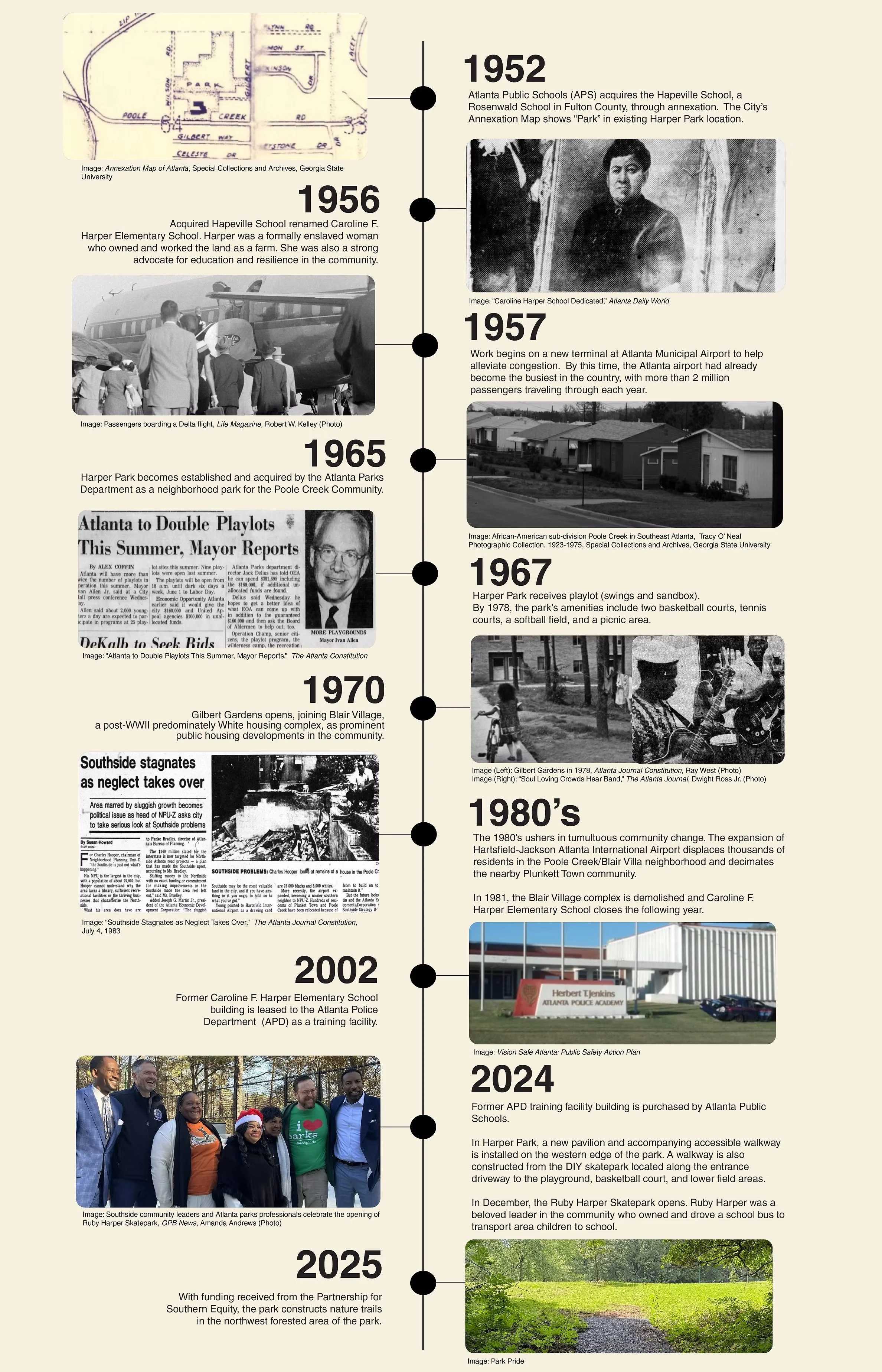 Harper Park and the Blair Villa/Poole Creek area were deeply shaped by systemic racism and Atlanta’s airport expansion, which displaced families, fractured neighborhoods, and disrupted nearby Black schools like the Rosenwald Schools—once vital centers of education and community. Facing this history is key to understanding both the community’s resilience and the forces that continue to shape the park today.