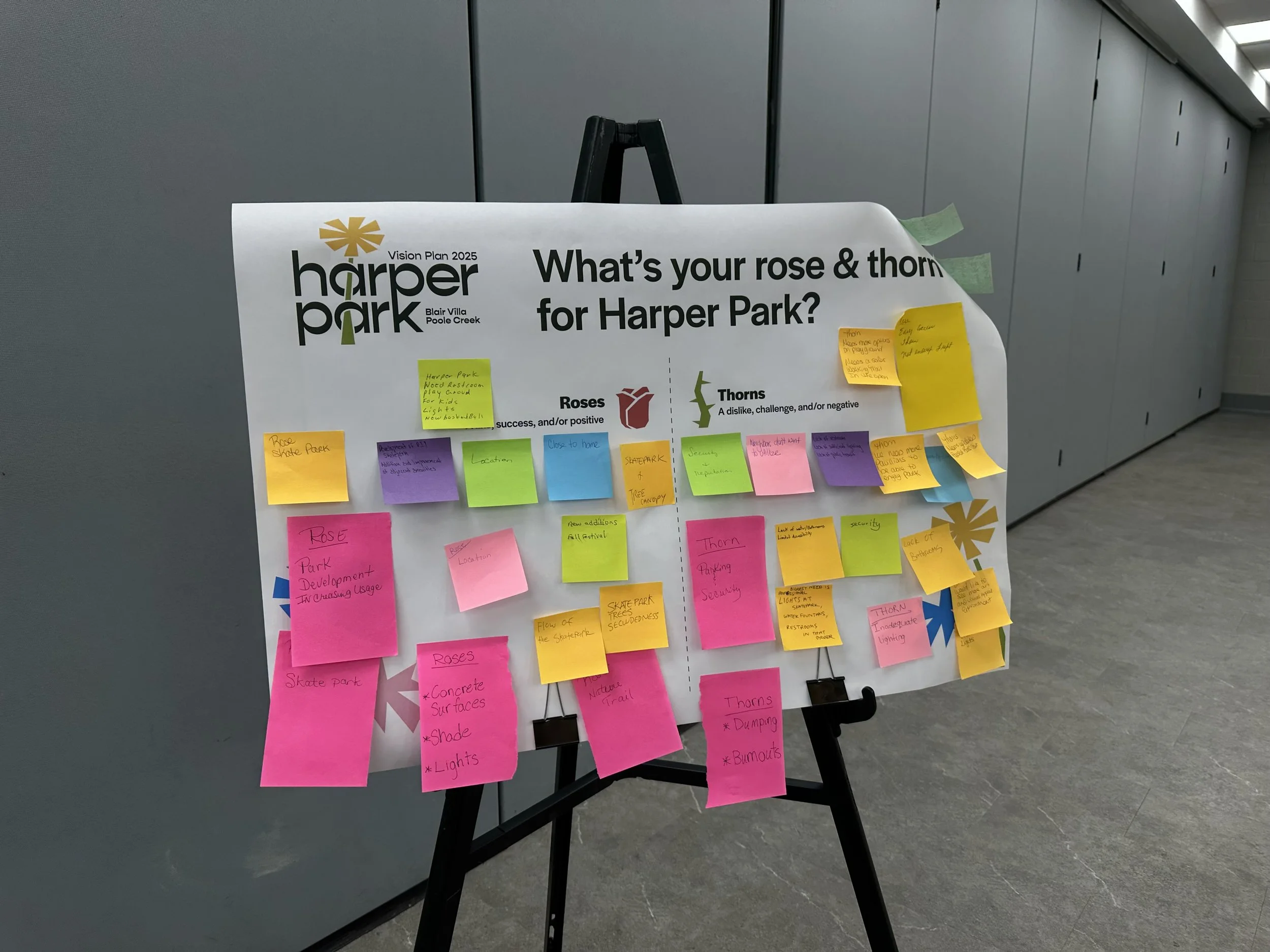 To make sure Harper Park’s brand and vision plan reflected the community, we built user research and data collection into every step of the process. The goal was simple: give residents different ways to share their voices and make sure those voices guided the decisions. From interactive activities during meetings to surveys and feedback boards, each method offered a unique lens—together creating a fuller picture of how people see the park and what they want it to become.