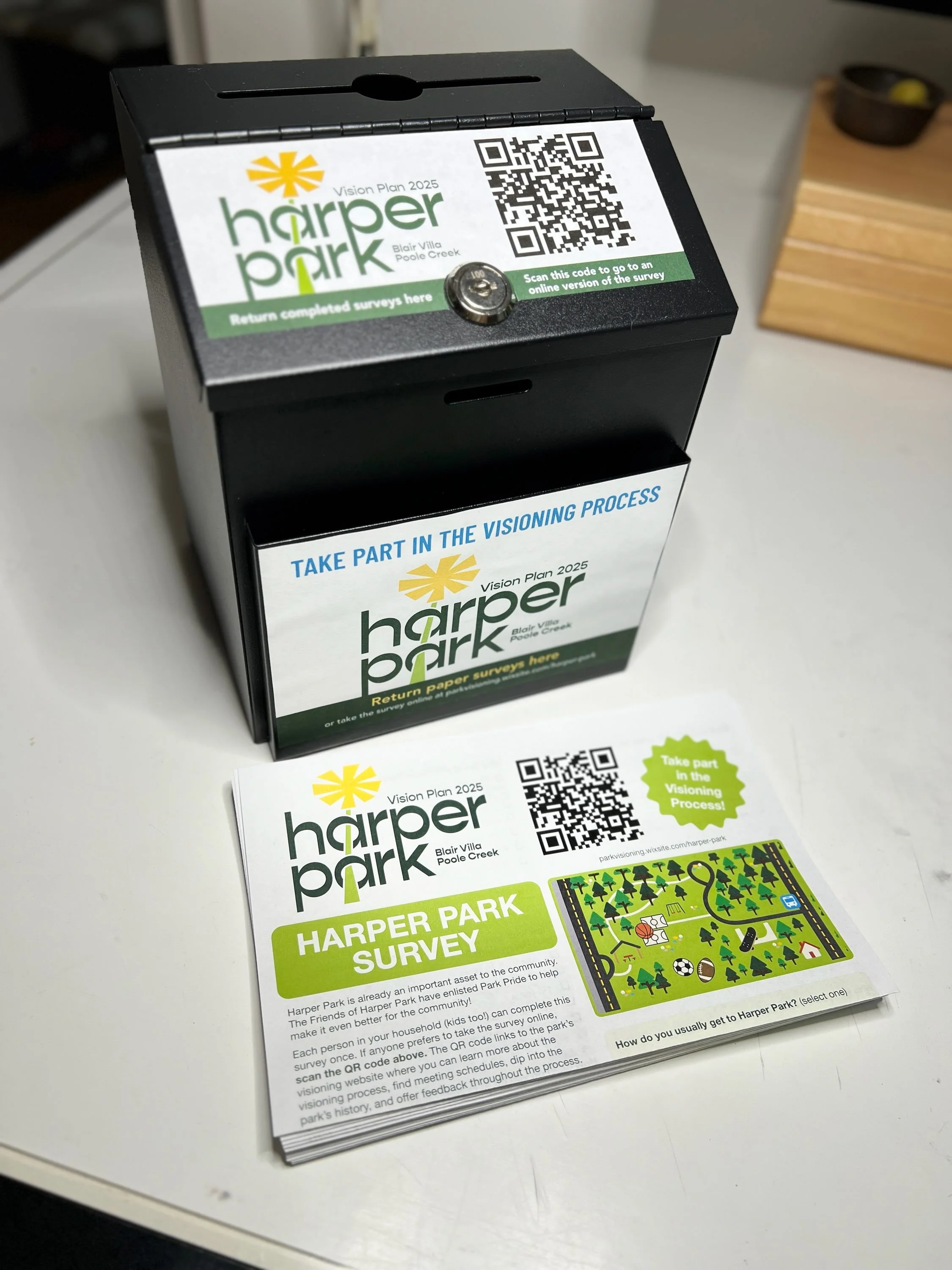 The physical survey was designed as a separate version and placed in key spots like the skate park, gazebo, and Rosel Fann Recreation Center, with drop boxes for responses. We also delivered copies directly to nearby residents identified during committee meetings as important voices to include. Both versions asked about the best and most challenging aspects of Harper Park, along with ideas for improvements, while also giving us a sense of how many residents were engaging in the visioning process.