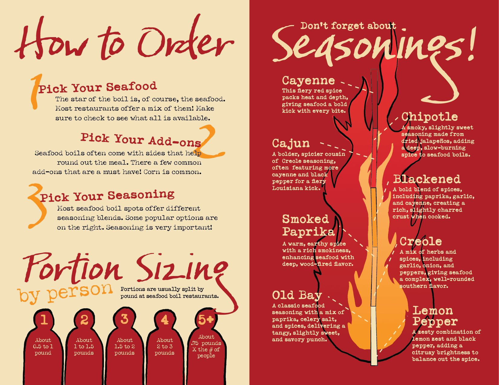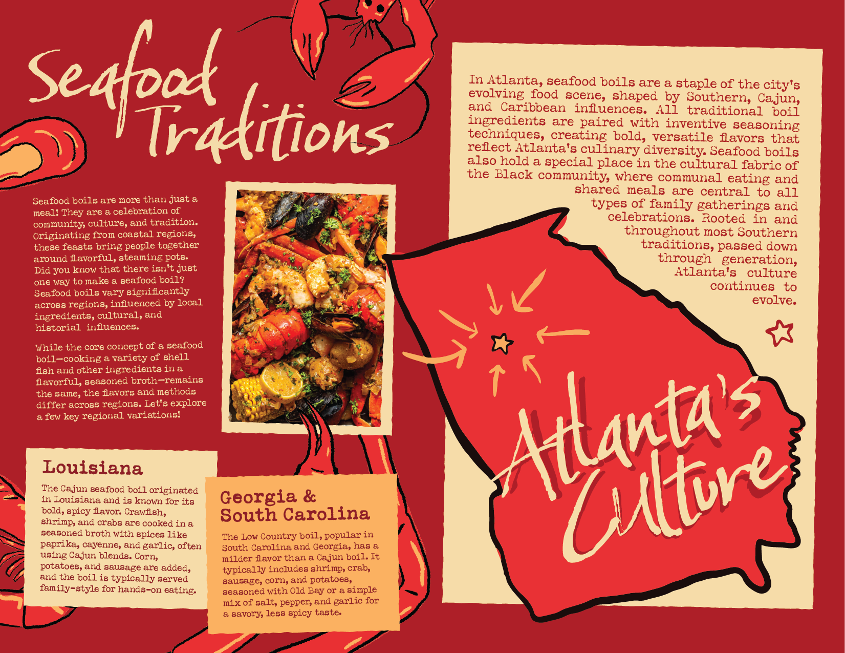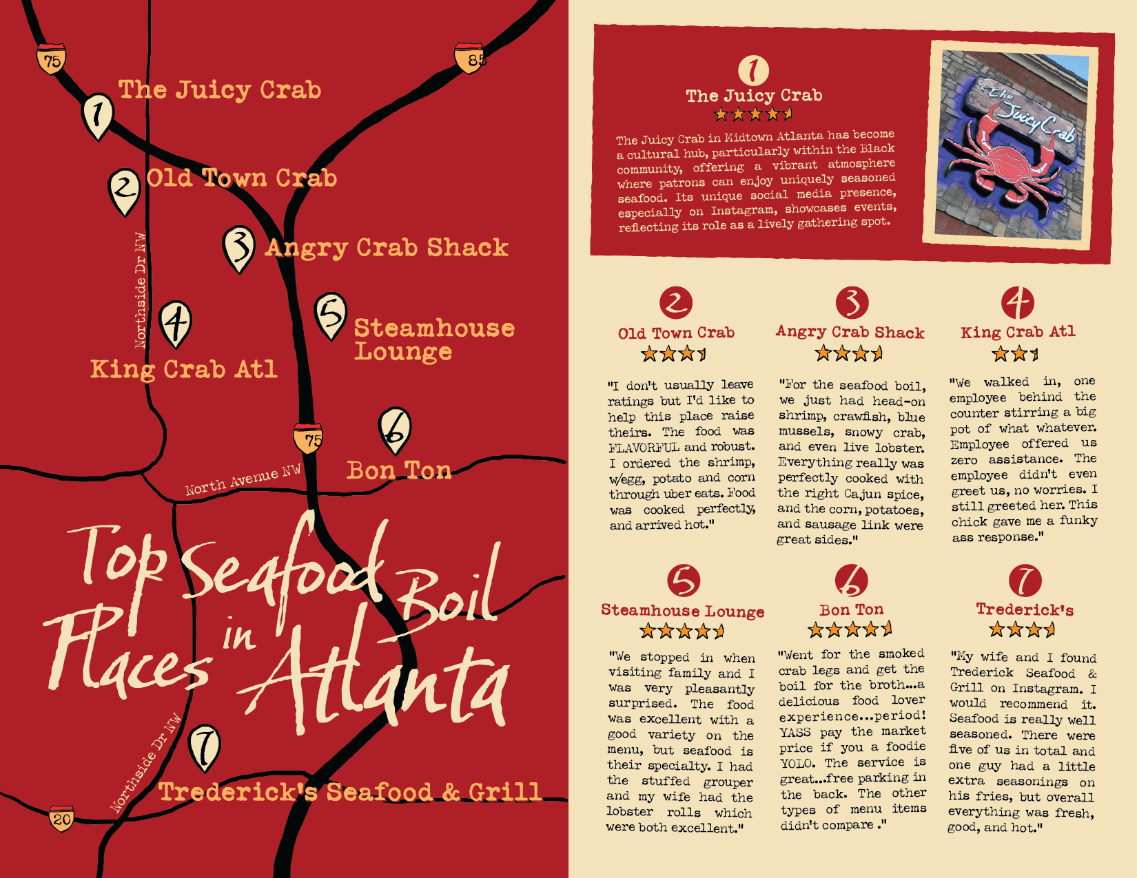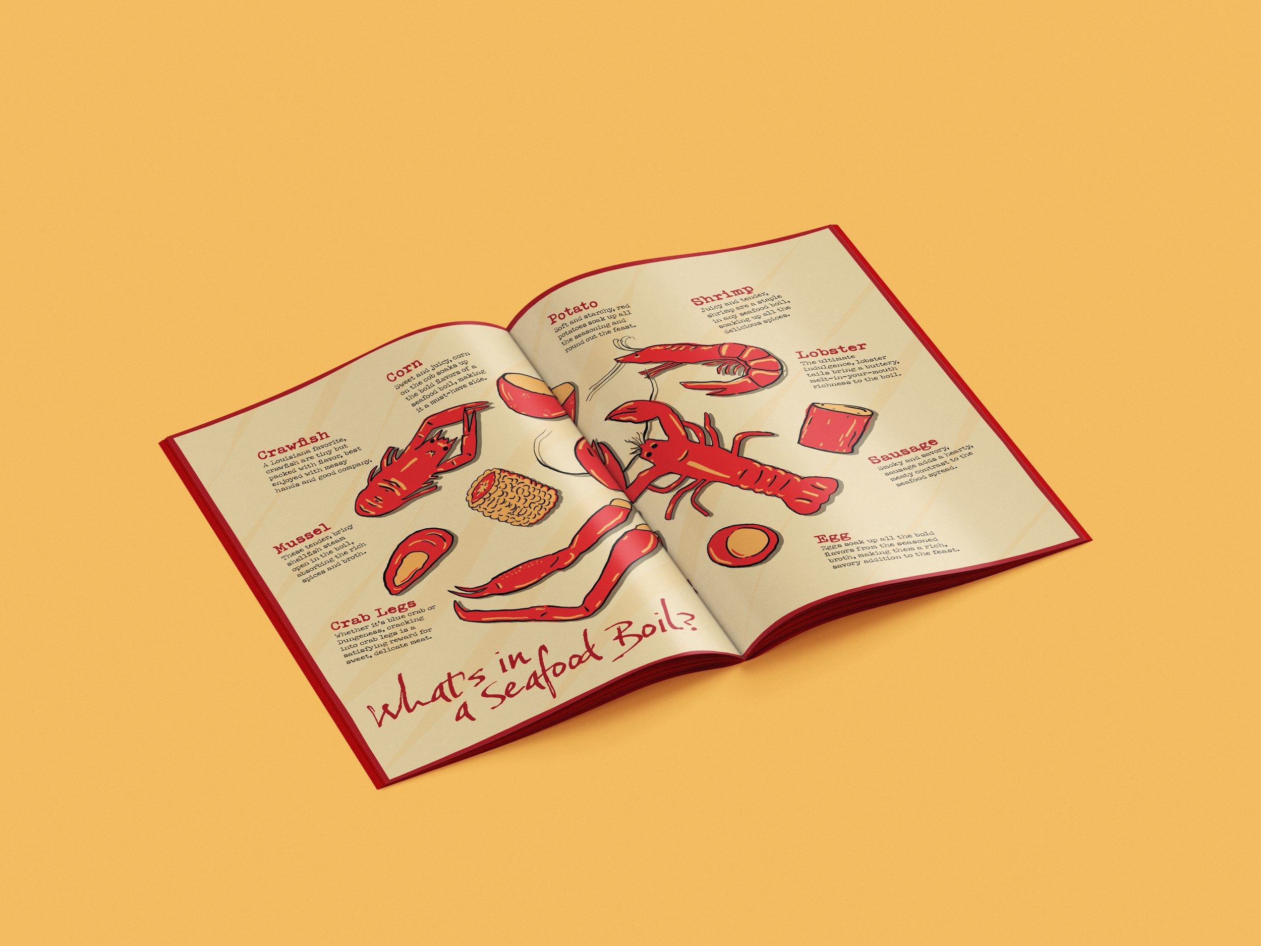 The challenge was turning a messy, hands on food experience into something clear, engaging, and visually organized without losing the personality of Atlanta’s seafood boil culture. I had to balance useful guidance with storytelling, making sure information like spice levels, ordering tips, and local spots felt fun instead of instructional.